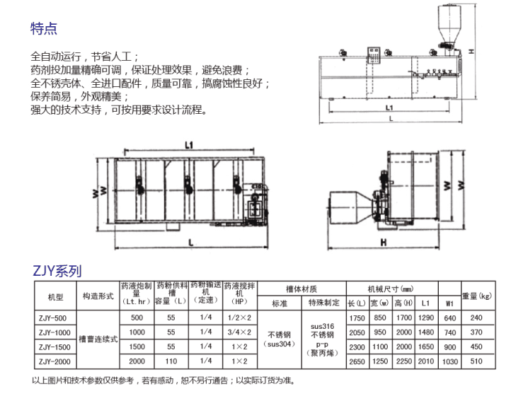 | 機型 | 構造形式 | 藥液泡制量 (Lt.hr) | 藥粉供料槽 容量(L) | 藥粉輸送機 (定速) | 藥業(yè)攪拌機 (HP) | 槽體材質 | 機械尺寸(mm) | 重量(kg) | |||||